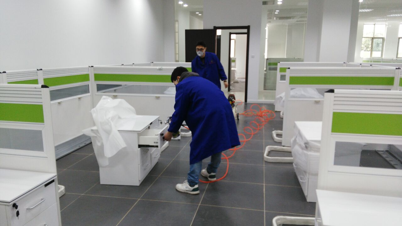 根據實地考察該單位裝修特點,結合先前檢測的數據報告,我們?yōu)槠渥隽嗽敿毜氖┕ぶ卫矸桨?,并報其公司領導審核,經刪選同意并認可我公司的施工治理方案。經過施工治理——復檢修補——驗收審核等工序,該工程于近日全部完工。下圖為工程施工現場: